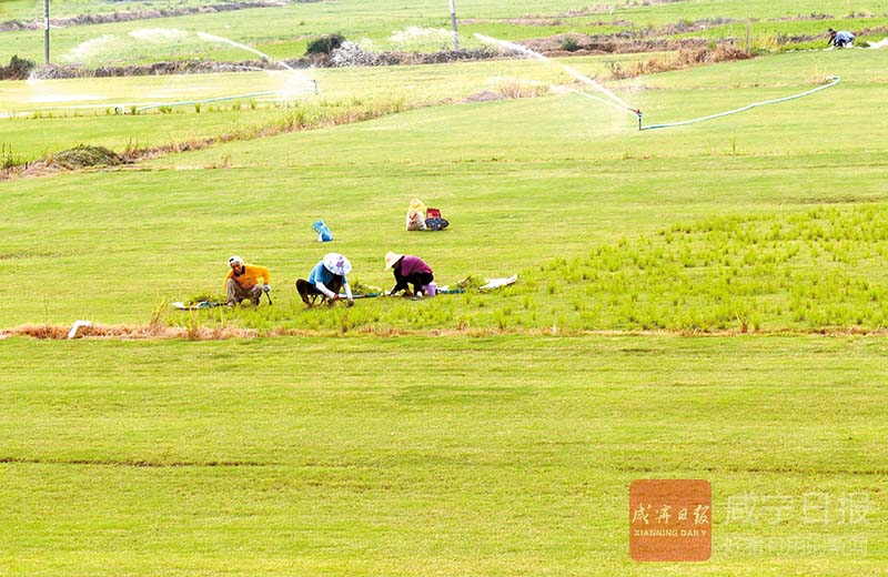 12日,赤壁市茶庵嶺鎮(zhèn)云臺山村青青草坪種植基地,工人正對草坪實(shí)施除雜、噴灌。