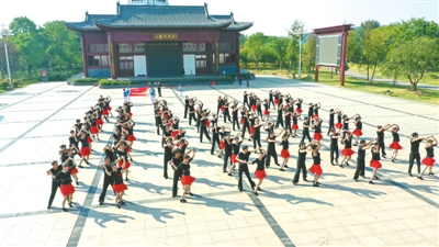 9月8日,在嘉魚二喬公園,嘉魚交誼舞團(tuán)隊100多名舞者,正在錄制嘉魚交誼舞團(tuán)隊與軍運會同行《兵兵三步踩》,該視頻將在武漢軍運會期間播放。