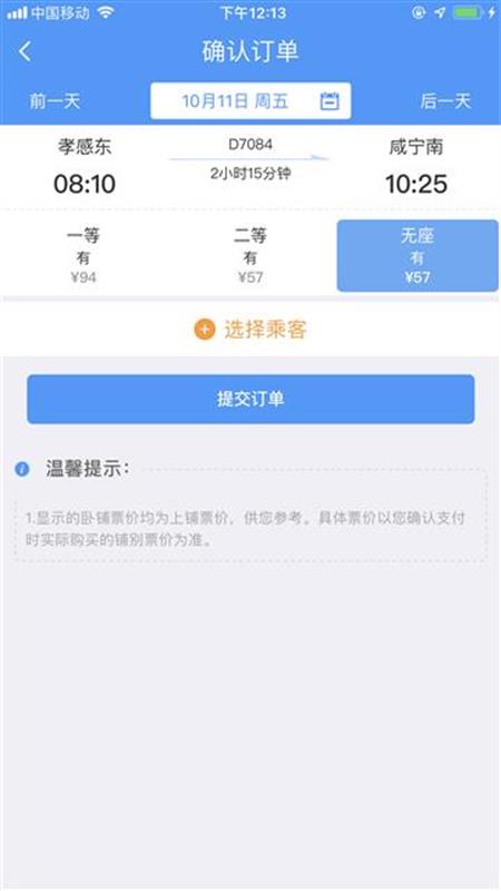 票價方面:一等座94元,二等座57元,無座57元。