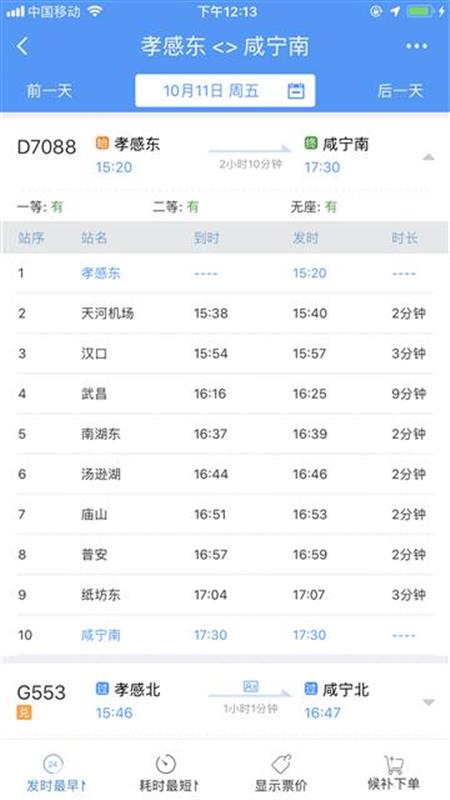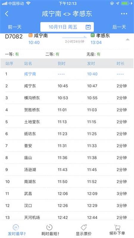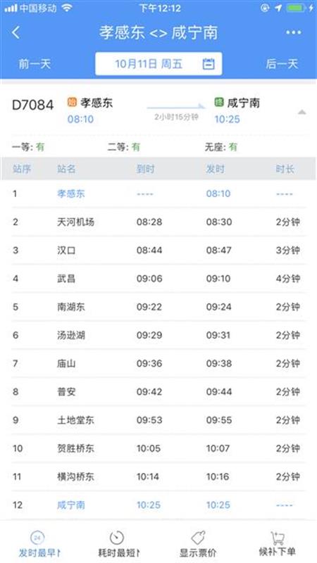 10時40分從咸寧南始發(fā),沿途??肯虒帠|、橫溝橋東、賀勝橋東、土地堂東、紙坊東、普安、廟山、湯遜湖、南湖東、武昌、漢口、天河機(jī)場等站,13時04分終到孝感東站;