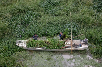 10月15日,工人們正在淦河窯嘴大橋處打撈外來物種水葫蘆。據(jù)悉,因水葫蘆繁殖過快,若成片聚集會造成水質(zhì)惡化。入夏以來,向陽湖國家濕地公園管理處將外來物種清理列為常規(guī)工作,不定期組織人員在公園內(nèi)進(jìn)行打撈清除,守護(hù)一湖清水。通訊員吳濤徐元紅攝