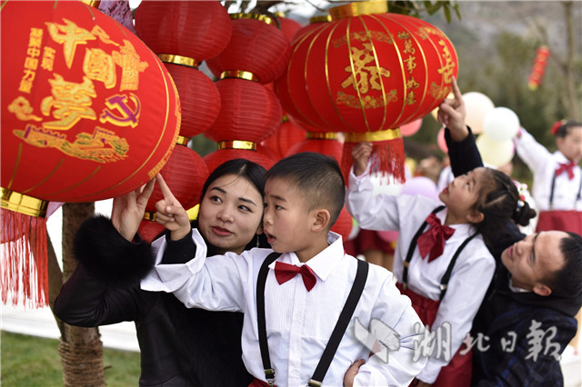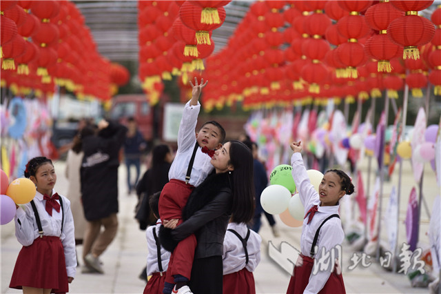 2019年2月2日,小朋友在通城縣塘湖鎮(zhèn)荻田村紅色廣場紅燈籠旁合影。當日,湖北省通城縣塘湖鎮(zhèn)荻田村在紅色廣場舉行花傘彩燈民俗節(jié)活動,以趕集逛廟會,舞龍、旗袍秀、跳廣場舞、觀花傘彩燈、草扎、鄉(xiāng)土美味等多彩民間活動展示美麗鄉(xiāng)村建設(shè)成果,在濃濃的年味中喜迎新春。(視界網(wǎng)劉建平攝)