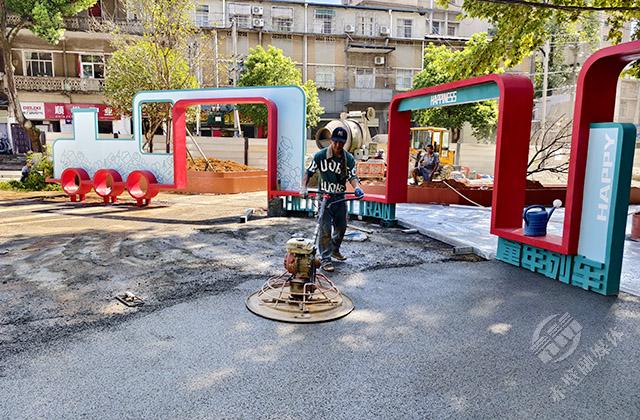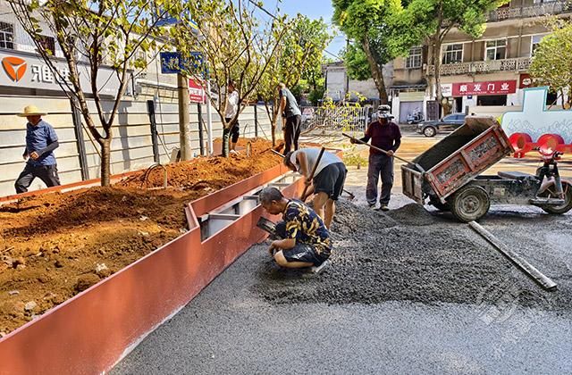 8月8日,在赤壁市車站路兒童友好街區(qū)施工現(xiàn)場,來自赤壁建工集團(tuán)的工人們,正在機(jī)械的配合下,有條不紊地進(jìn)行著街道改造施工。