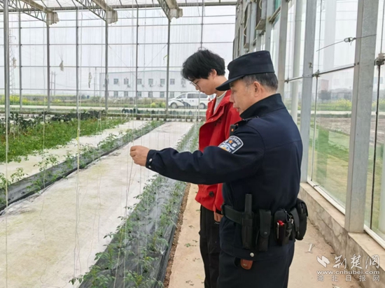 在湖北嘉魚蔬菜科技園,農業(yè)數(shù)字化服務站監(jiān)測屏實時更新著氣象信息、病蟲害防范等農事數(shù)據;空中植保無人機有序開展施肥噴藥作業(yè);田埂上,潘家灣派出所民輔警常態(tài)化開展動態(tài)巡邏,及時排查各類安全隱患、快速調解涉農矛盾糾紛,全力維護田間生產秩序。