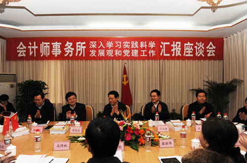 在座談會(huì)上,潘立剛同志分別聽取了王文童同志關(guān)于全省會(huì)計(jì)師事務(wù)所開展深入學(xué)習(xí)實(shí)踐科學(xué)發(fā)展觀活動(dòng)和注冊(cè)會(huì)計(jì)師行業(yè)黨建工作情況的匯報(bào),武漢市財(cái)政局總會(huì)計(jì)師、市財(cái)政局會(huì)計(jì)師事務(wù)所深入學(xué)習(xí)實(shí)踐科學(xué)發(fā)展觀活動(dòng)指導(dǎo)小組副組長(zhǎng)張灼、襄樊市財(cái)政局副局長(zhǎng)、市財(cái)政局會(huì)計(jì)師事務(wù)所深入學(xué)習(xí)實(shí)踐科學(xué)發(fā)展觀活動(dòng)指導(dǎo)小組副組長(zhǎng)馬琦林、咸寧市財(cái)政局黨組成員、市會(huì)計(jì)師事務(wù)所深入學(xué)習(xí)實(shí)踐科學(xué)發(fā)展觀活動(dòng)指導(dǎo)小組副組長(zhǎng)張麗華以及中勤萬(wàn)信會(huì)計(jì)師事務(wù)所黨支部書記、董事長(zhǎng)張金才,武漢眾環(huán)會(huì)計(jì)師事務(wù)所董事長(zhǎng)、武漢市注冊(cè)會(huì)計(jì)師行業(yè)黨委副書記黃光松,咸寧永興會(huì)計(jì)師事務(wù)所所長(zhǎng)、咸安區(qū)政協(xié)委員張麗平等同志先后匯報(bào)發(fā)言。大信會(huì)計(jì)師事務(wù)所湖北分所、中瑞岳華會(huì)計(jì)師事務(wù)所湖北分所、武漢興業(yè)會(huì)計(jì)師事務(wù)所、襄樊華炬會(huì)計(jì)師事務(wù)所黨支部書記也參加了此次座談。