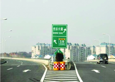 三環(huán)線由天興洲大橋往東新開發(fā)區(qū)光谷大道的一塊指路牌,左行指的是“關(guān)豹高速”,右行指的是“光谷大道”;但該路口左行是經(jīng)武黃高速去鄂州方向的,右行是經(jīng)三環(huán)線去白沙洲大橋方向的。路牌因信息不全、牌面又小,不少駕車人員到該路口時停車查看,不知行進方向。